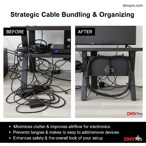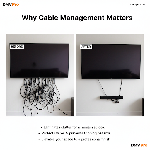 • DMV Pro Advantage: Our technicians are experts at minimizing cable visibility even when they can’t be fully concealed, using clever routing and organization techniques.